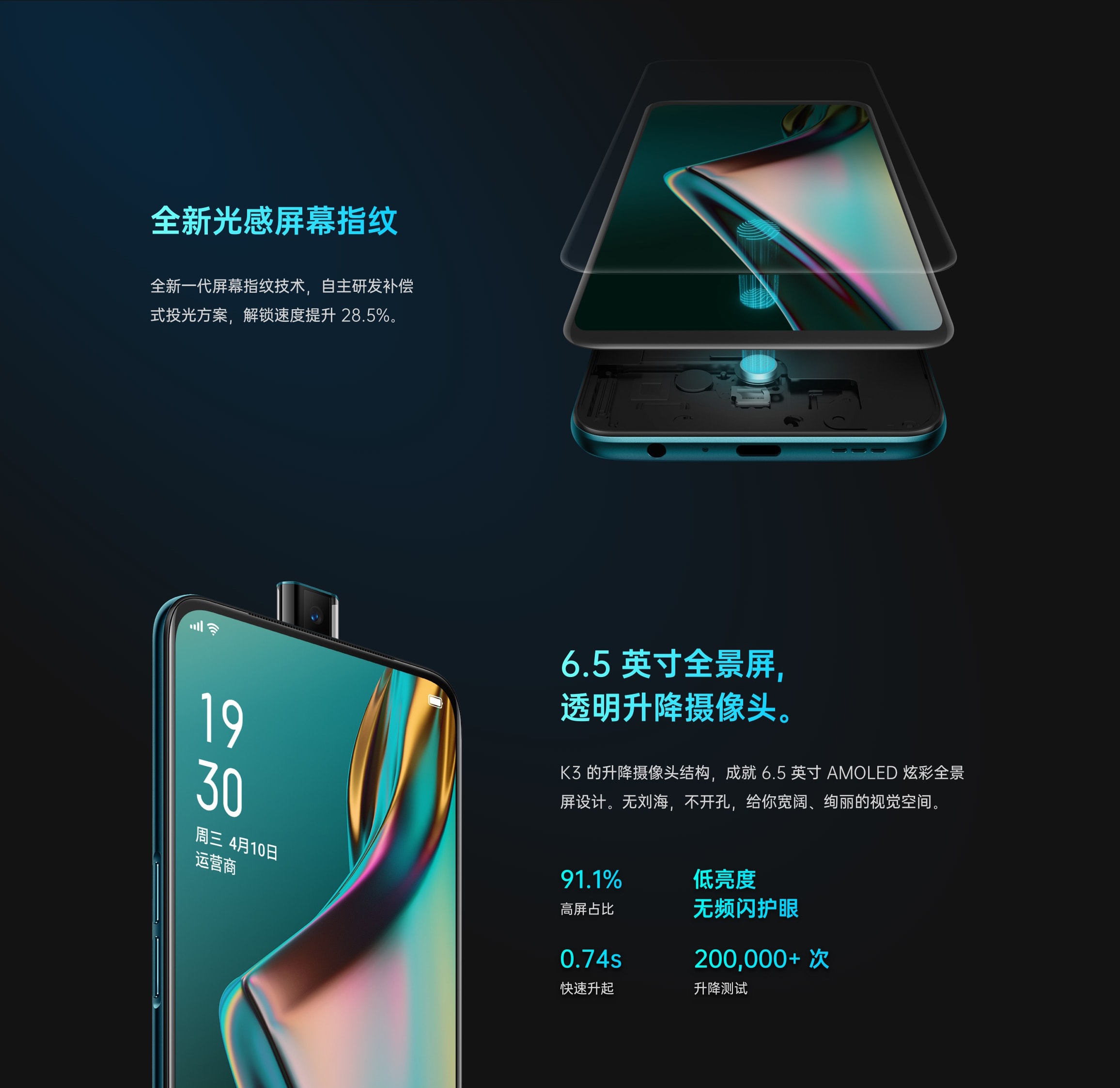 2019-05-24官方回复:亲爱哒O粉,看到您如此喜欢我们的产品,小O感觉自己特别自豪,您的认可是小O专注服务的最大动力,K3采用6.5英寸全景屏设计,屏幕无遮挡,屏占比更高,正面看上去全都是屏;同时采用光棱升降摄像头,升降速度更快,支持20万次升降,更加耐用;OPPO一直致力于将品牌做到更好,努力让产品更精美,后期您在使用中所遇到的问题都可以及时向我们专业的客服同学反馈,我们努力做到更好,祝您生活愉快!